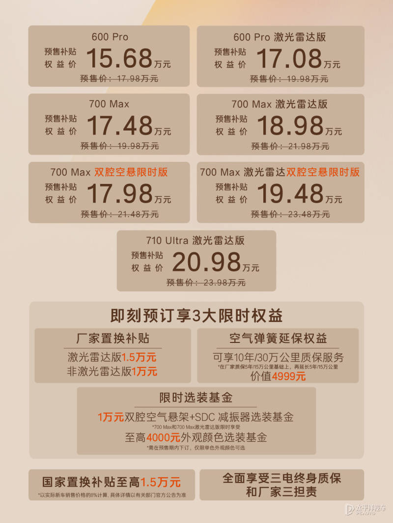 一、限时置换补贴——针对激光雷达版提供1.5万元厂家置换补贴,非激光雷达版提供1万元补贴,进一步降低换购门槛;