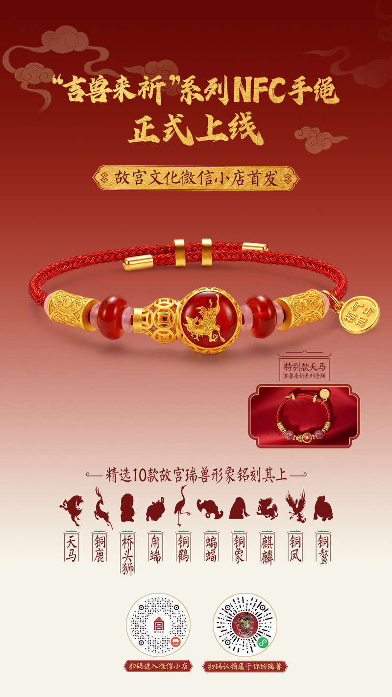 系列手绳精选天马、铜鹿、蝙蝠、麒麟等10只故宫瑞兽形象铭刻其上,让游客把紫禁城祥瑞文化带回家。手绳以“实体+数字”为创意,可触摸、可激活、可传播。