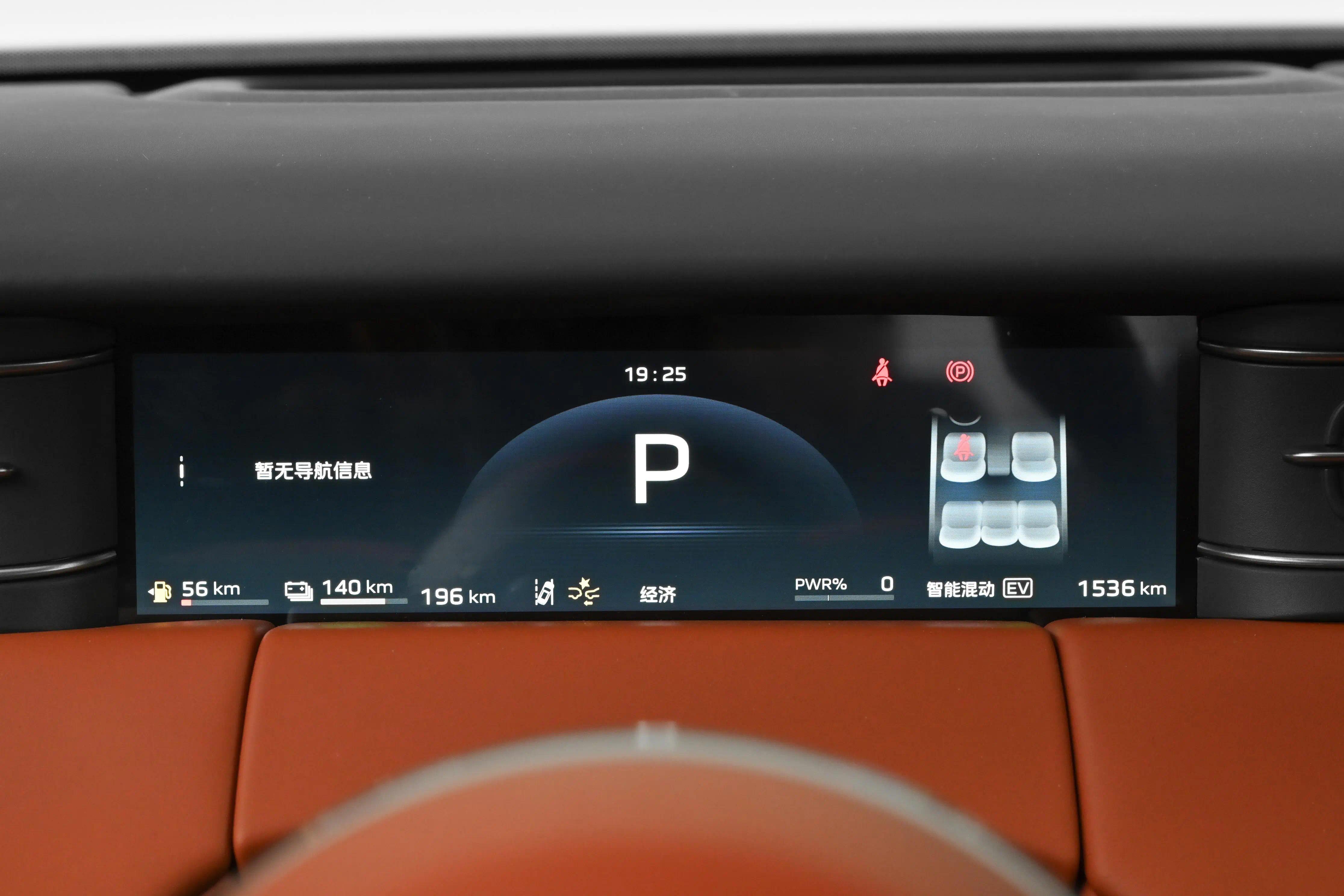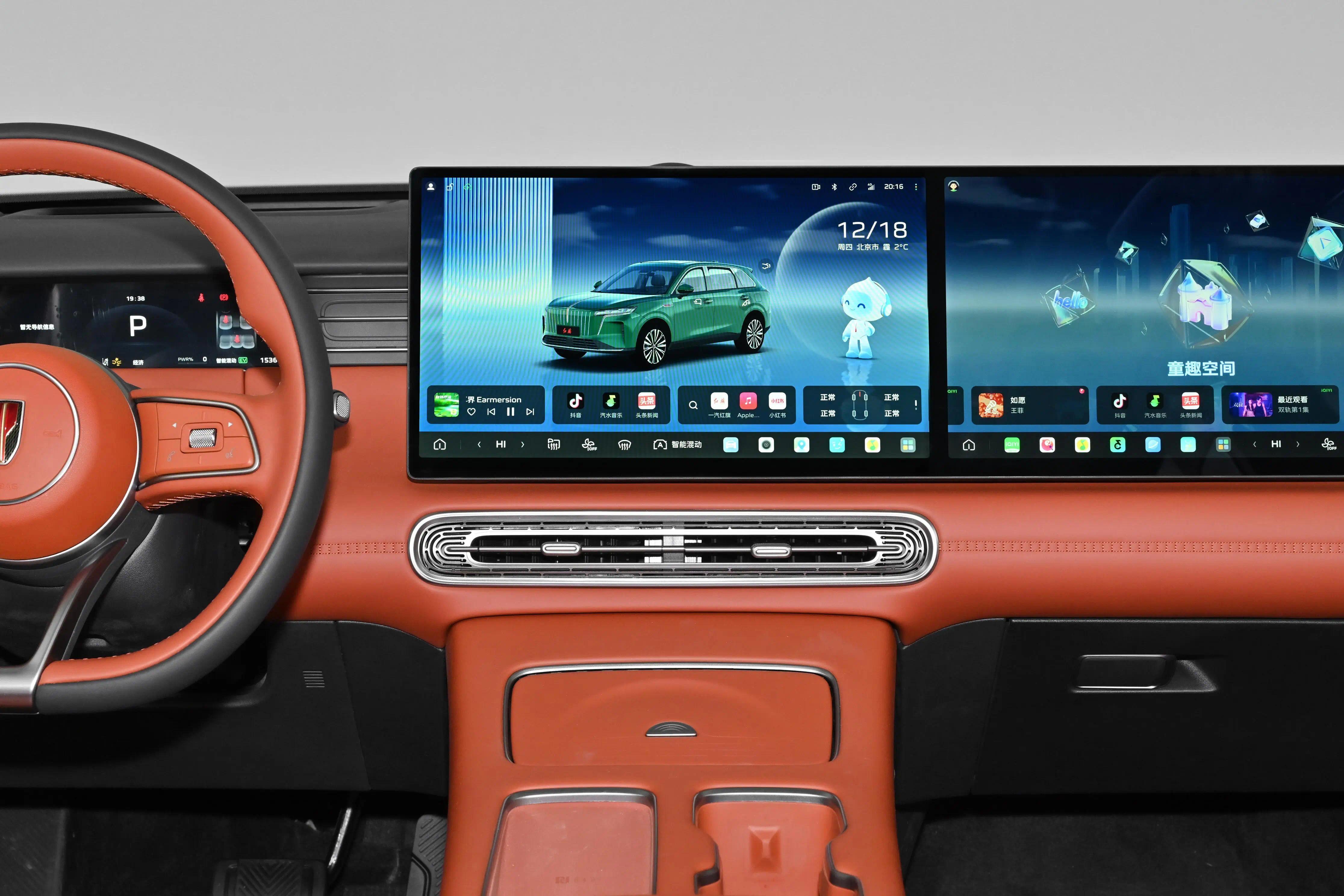 从外观部分进入到内饰方面,红旗HS6 PHEV的内饰设计主打的是精致与大气,内饰部分红旗HS6 PHEV也是跟随时代的发展,内饰主打的是简洁实用,但是在整体的质感方面也是以精致为主,大面积采用的是皮革包覆,细腻的皮质包覆搭配双拼色的内饰颜色,从视觉与感官能够感受到的也是满满的精致感;而在配置方面,这台车型配备有15.6+15.6寸2.5K双联屏,硬件配置还拥有高通8295P芯片+红旗自研“灵犀”车机系统,车机系统功能还是较为丰富的;