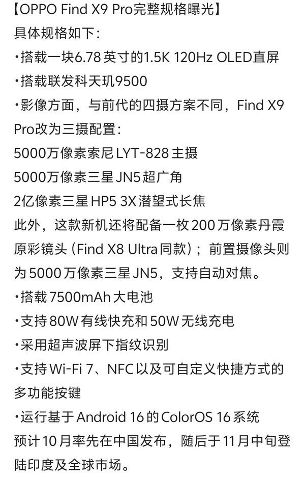 除了影像这一两点之外,根据之前网间曝光的信息汇总,OPPO Find X9 Pro将搭载天玑9500处理器,采用6.78英寸1.5K直屏,内置7500mAh左右的硅碳负极电池,支持80W有线快充+50W无线快充组合,预装运行基于Android 16的ColorOS 16系统,在周边配置方面,NFC、红外遥控、双扬声器、X轴马达、3D超声波指纹、IP68&69防尘防水、双频GPS+四频北斗导航,基本上是能给的都会给到。